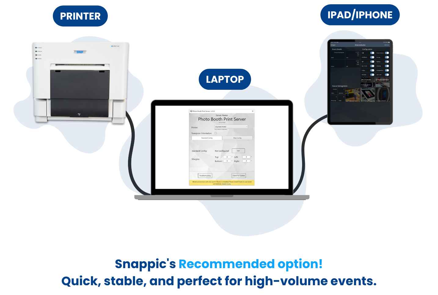 With Snappic’s wired printing, your iPad connects directly to your Mac or PC for: